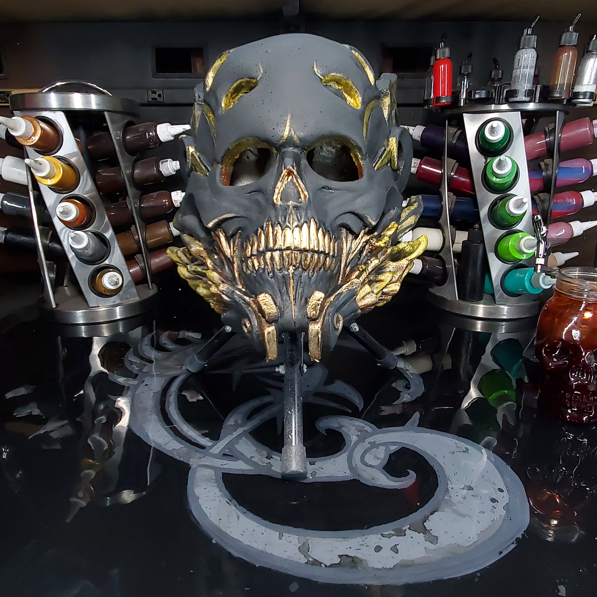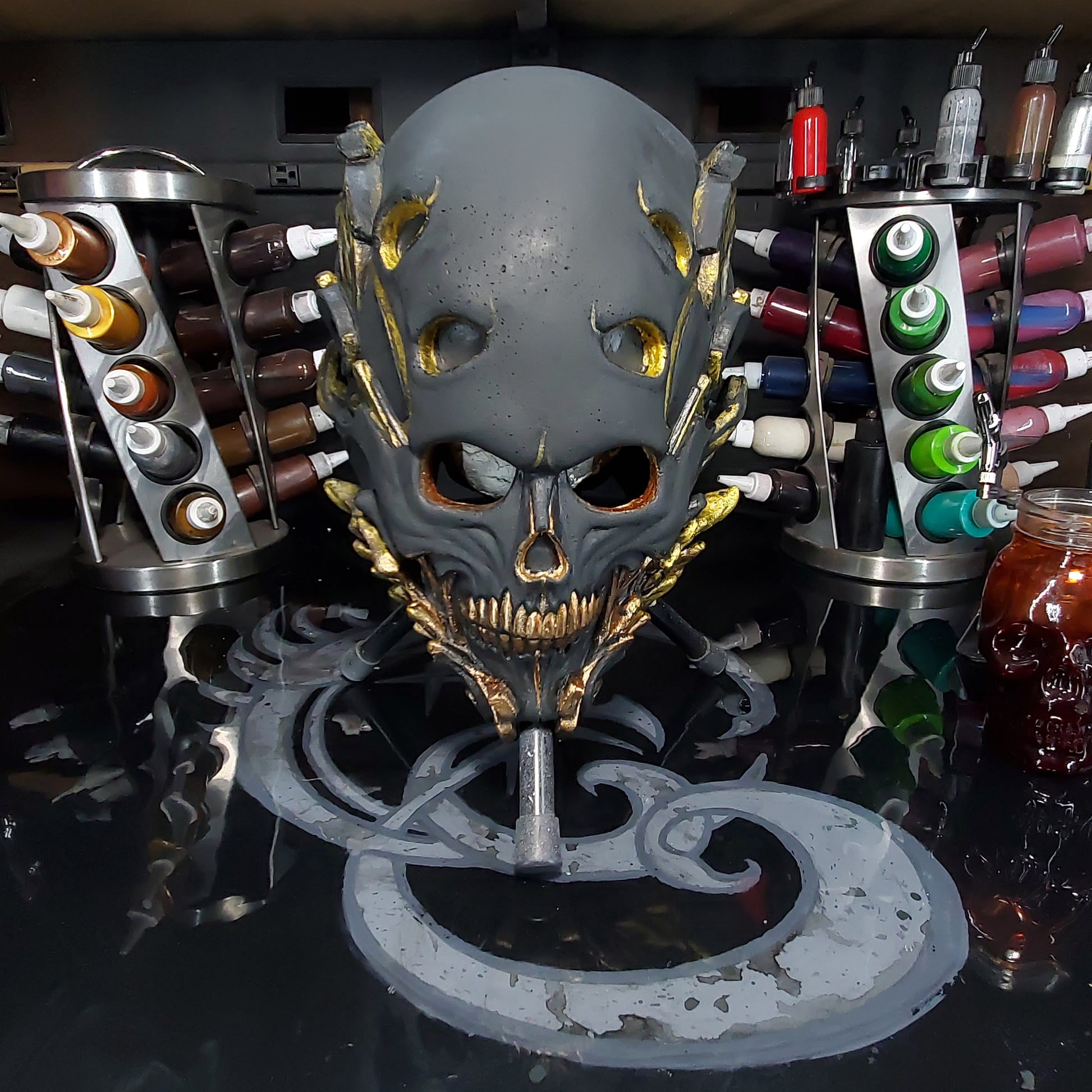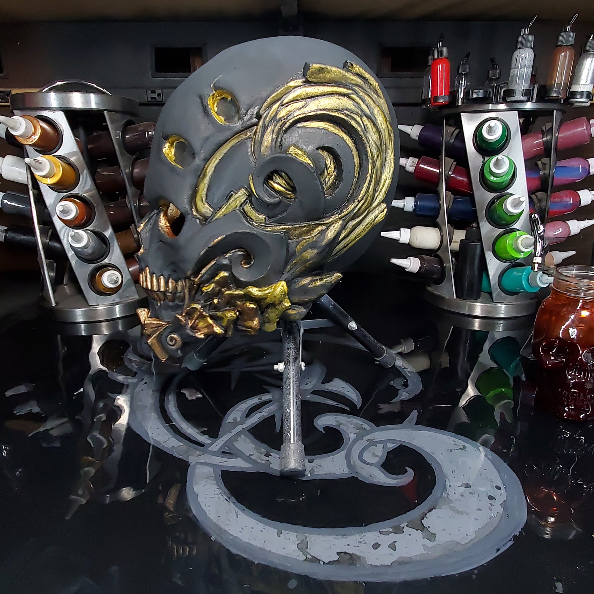 Welcome to REevilLution FX. The arsenal to your imagination. We bring you The one. An original design sculpted, molded and painted by yours truly. MR Grey. This Mask is a size XL. Or a 24 inch/ 62 cm circumference, or a 7 5/8 in hat size. These are made with the best latex in the industry. Monsters Maker liquid latex RD 407. Distributed by AFA supplies. Molded in hydrocal B11 from Aardvark Clay and Supplies. Sculpted in plastelina costumed in house.