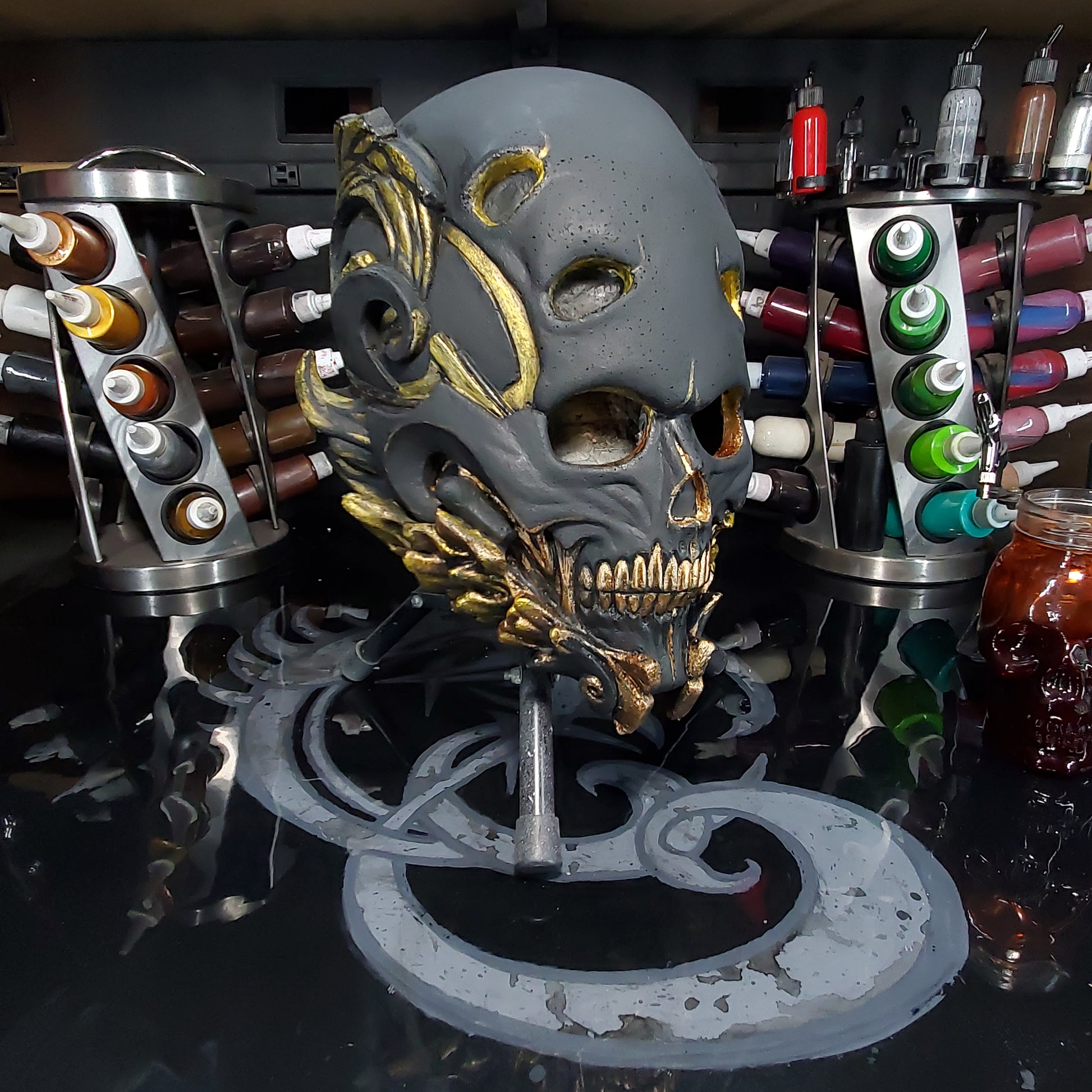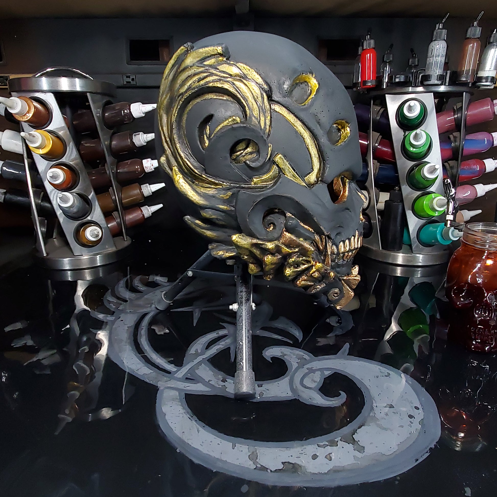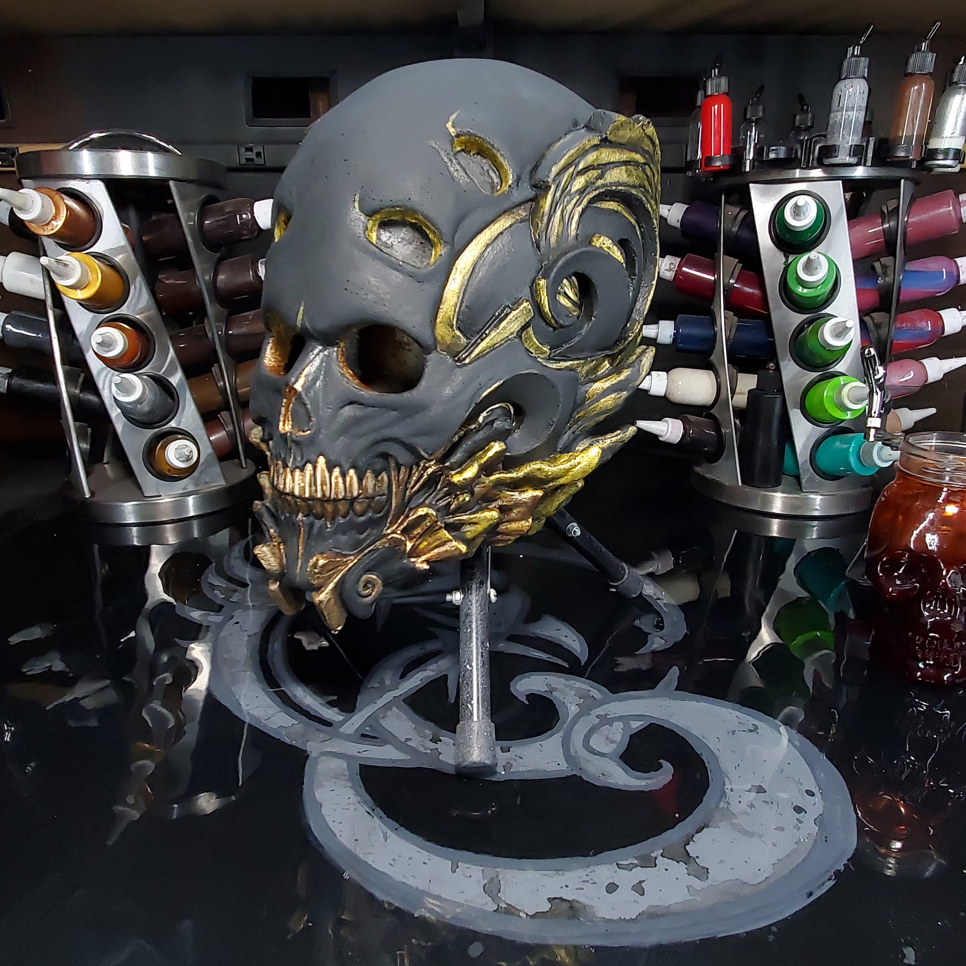 Welcome to REevilLution FX. The arsenal to your imagination. We bring you The one. An original design sculpted, molded and painted by yours truly. MR Grey. This Mask is a size XL. Or a 24 inch/ 62 cm circumference, or a 7 5/8 in hat size. These are made with the best latex in the industry. Monsters Maker liquid latex RD 407. Distributed by AFA supplies. Molded in hydrocal B11 from Aardvark Clay and Supplies. Sculpted in plastelina costumed in house.