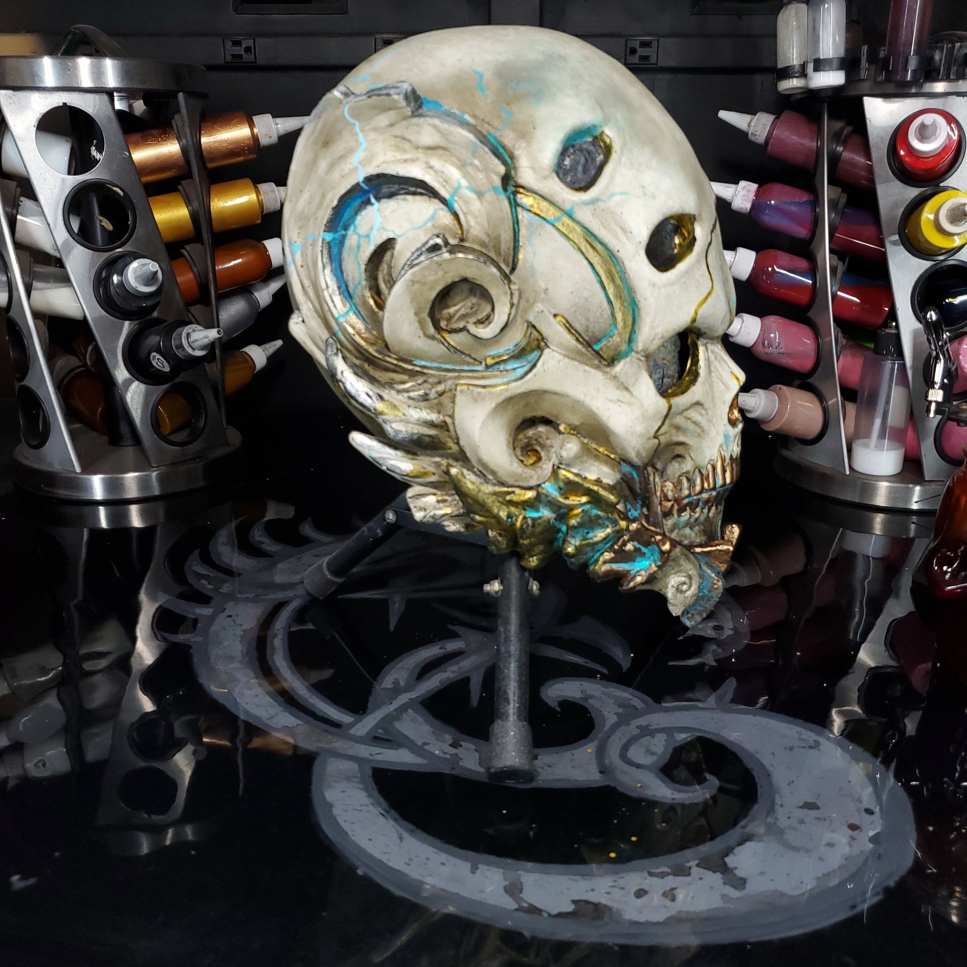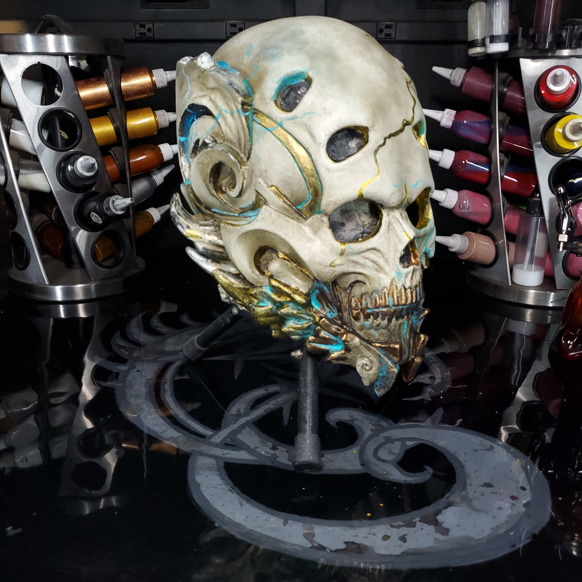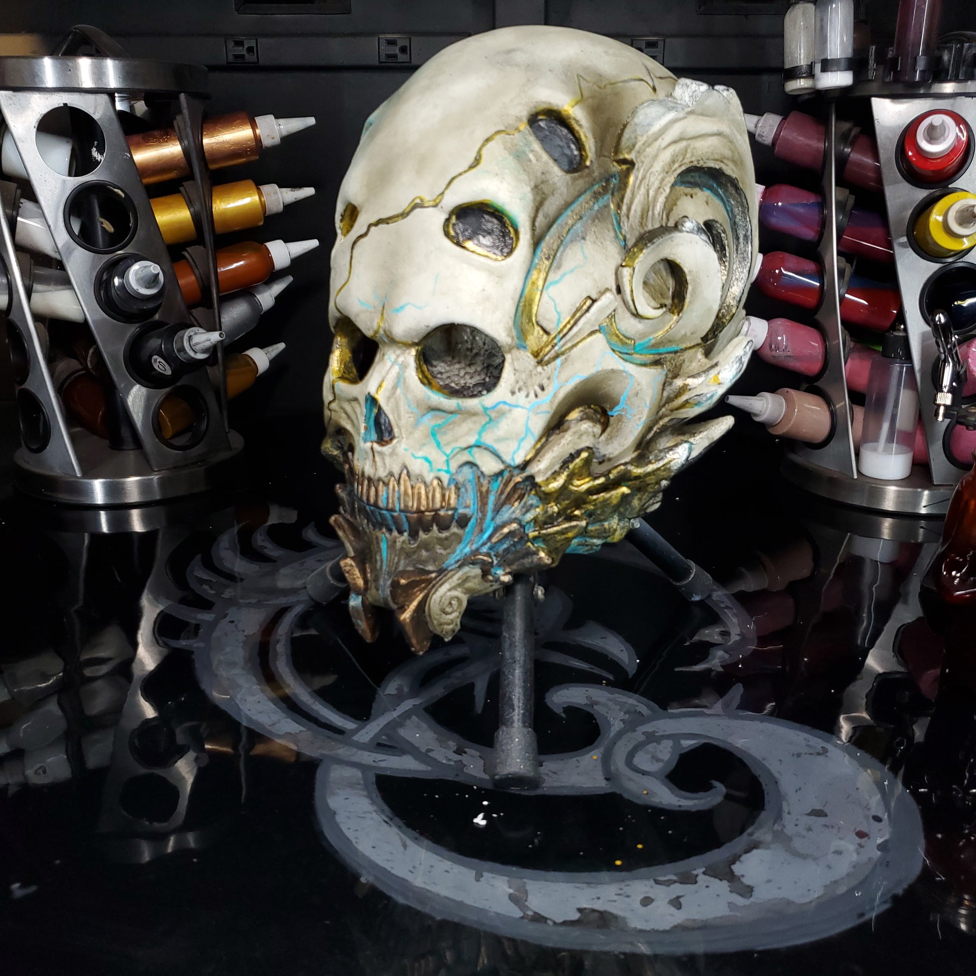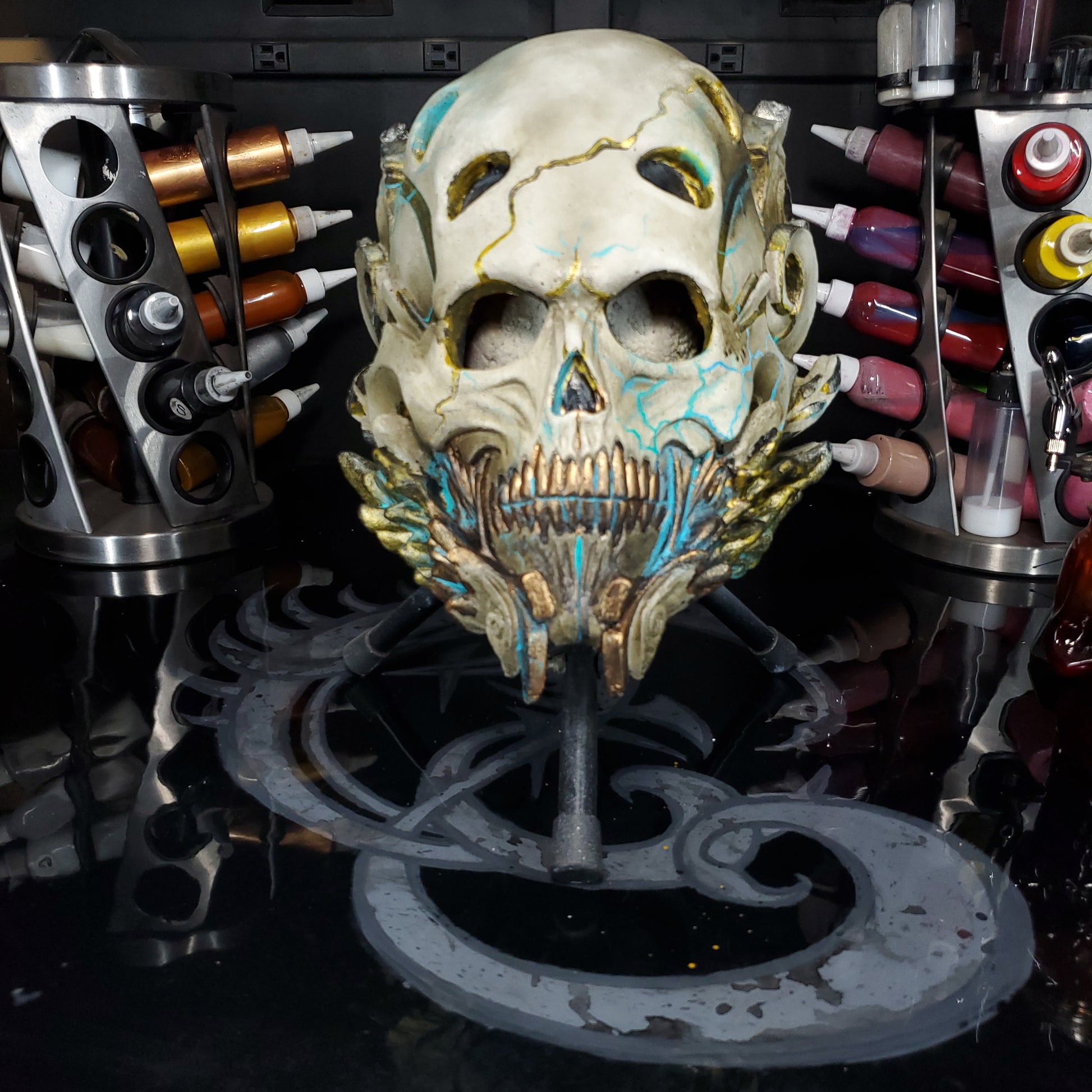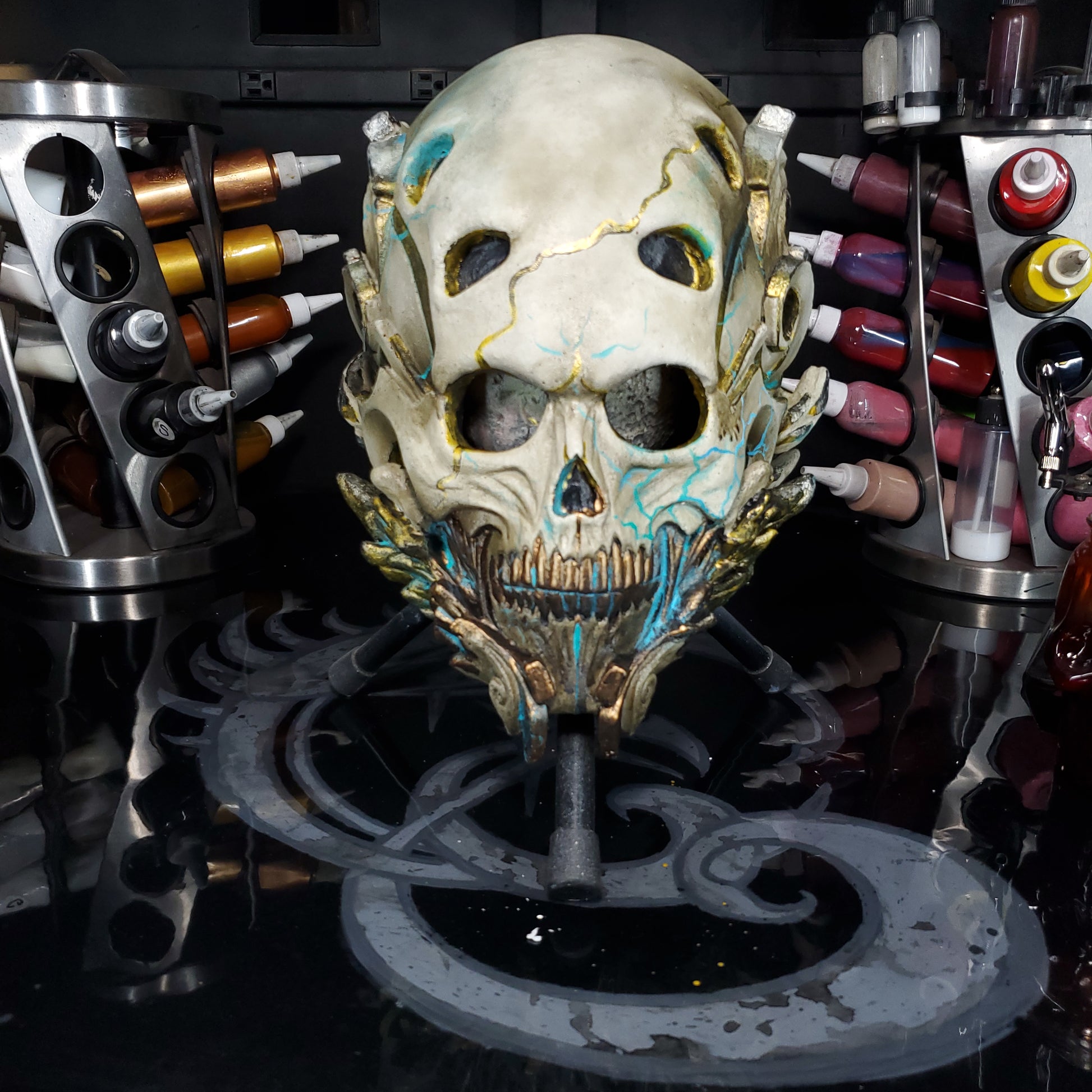 Welcome to REevilLution FX. The arsenal to your imagination. We bring you The one. An original design sculpted, molded and painted by yours truly. MR Grey. This Mask is a size XL. Or a 24 inch/ 62 cm circumference, or a 7 5/8 in hat size. These are made with the best latex in the industry. Monsters Maker liquid latex RD 407. Distributed by AFA supplies. Molded in hydrocal B11 from Aardvark Clay and Supplies. Sculpted in plastelina costumed in house.