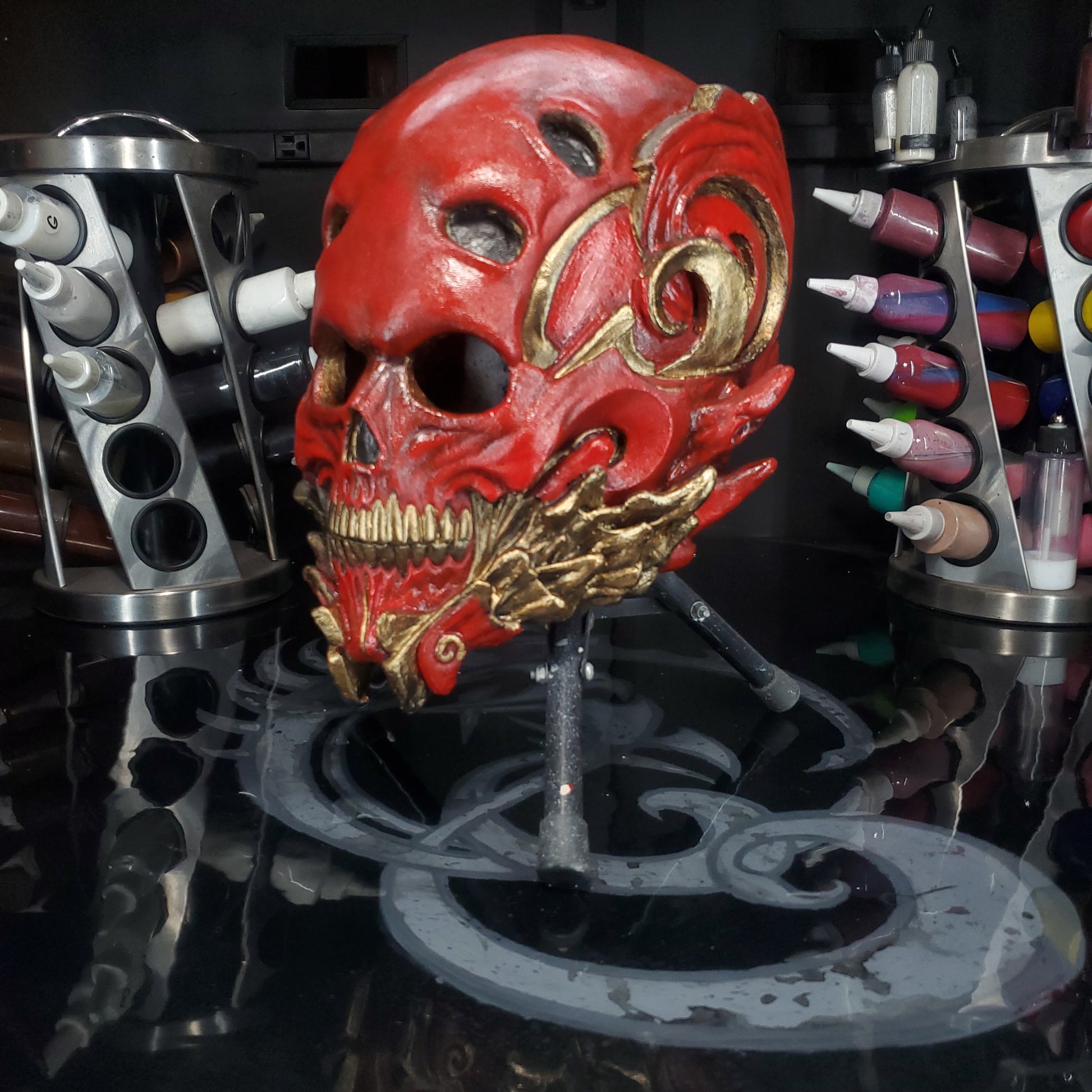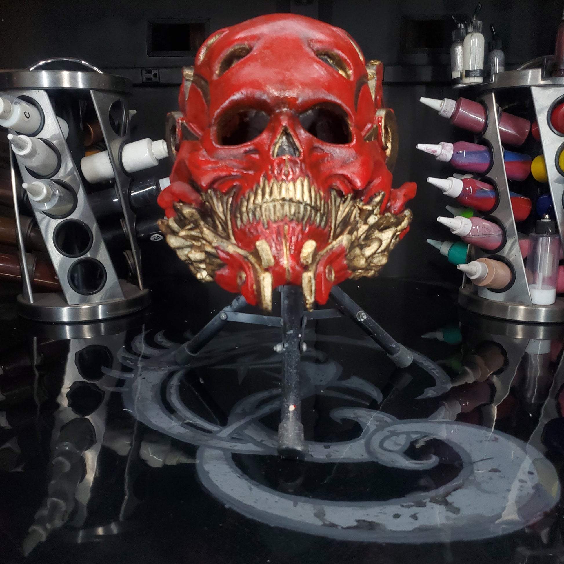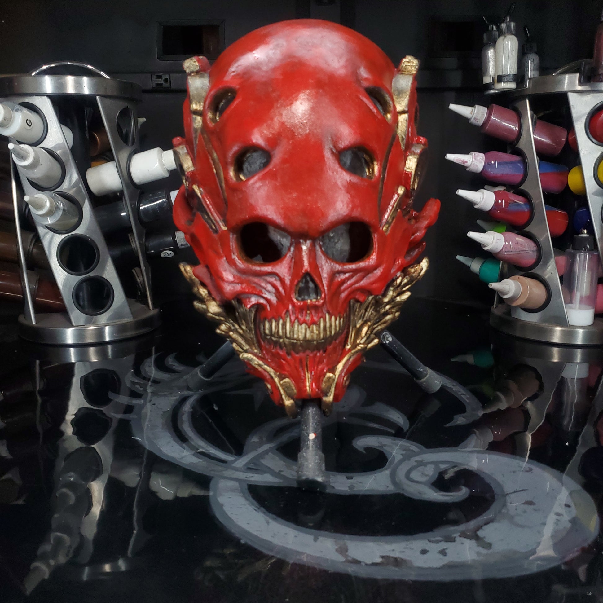 Welcome to REevilLution FX. The arsenal to your imagination. We bring you The one. An original design sculpted, molded and painted by yours truly. MR Grey. This Mask is a size XL. Or a 24 inch/ 62 cm circumference, or a 7 5/8 in hat size. These are made with the best latex in the industry. Monsters Maker liquid latex RD 407. Distributed by AFA supplies. Molded in hydrocal B11 from Aardvark Clay and Supplies. Sculpted in plastelina costumed in house.