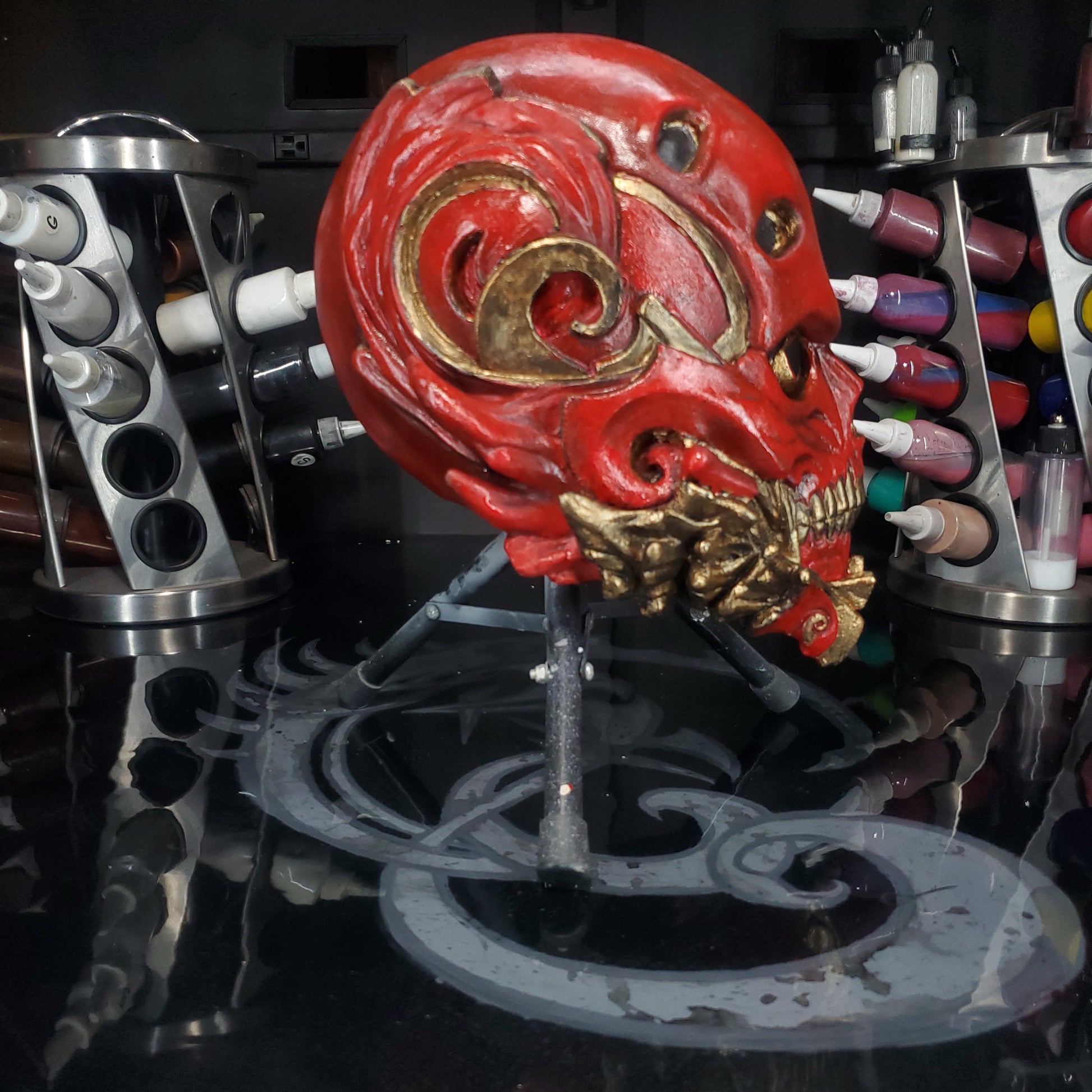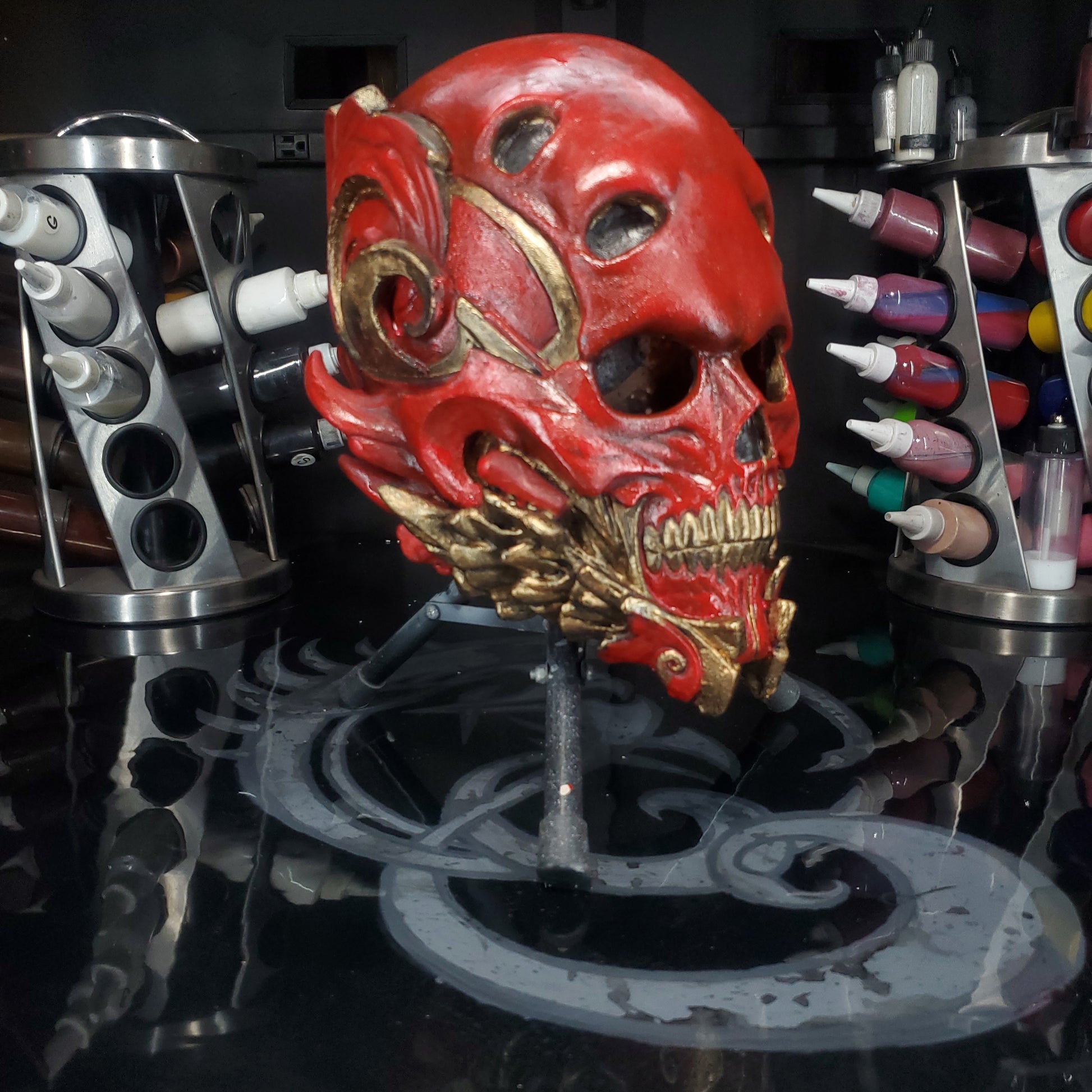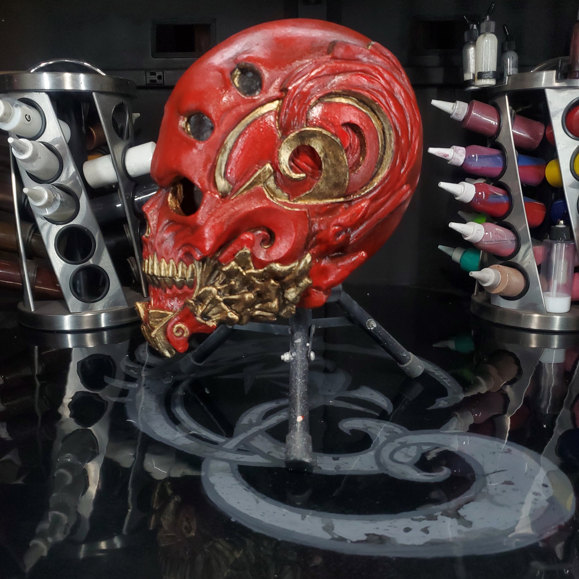 Welcome to REevilLution FX. The arsenal to your imagination. We bring you The one. An original design sculpted, molded and painted by yours truly. MR Grey. This Mask is a size XL. Or a 24 inch/ 62 cm circumference, or a 7 5/8 in hat size. These are made with the best latex in the industry. Monsters Maker liquid latex RD 407. Distributed by AFA supplies. Molded in hydrocal B11 from Aardvark Clay and Supplies. Sculpted in plastelina costumed in house.