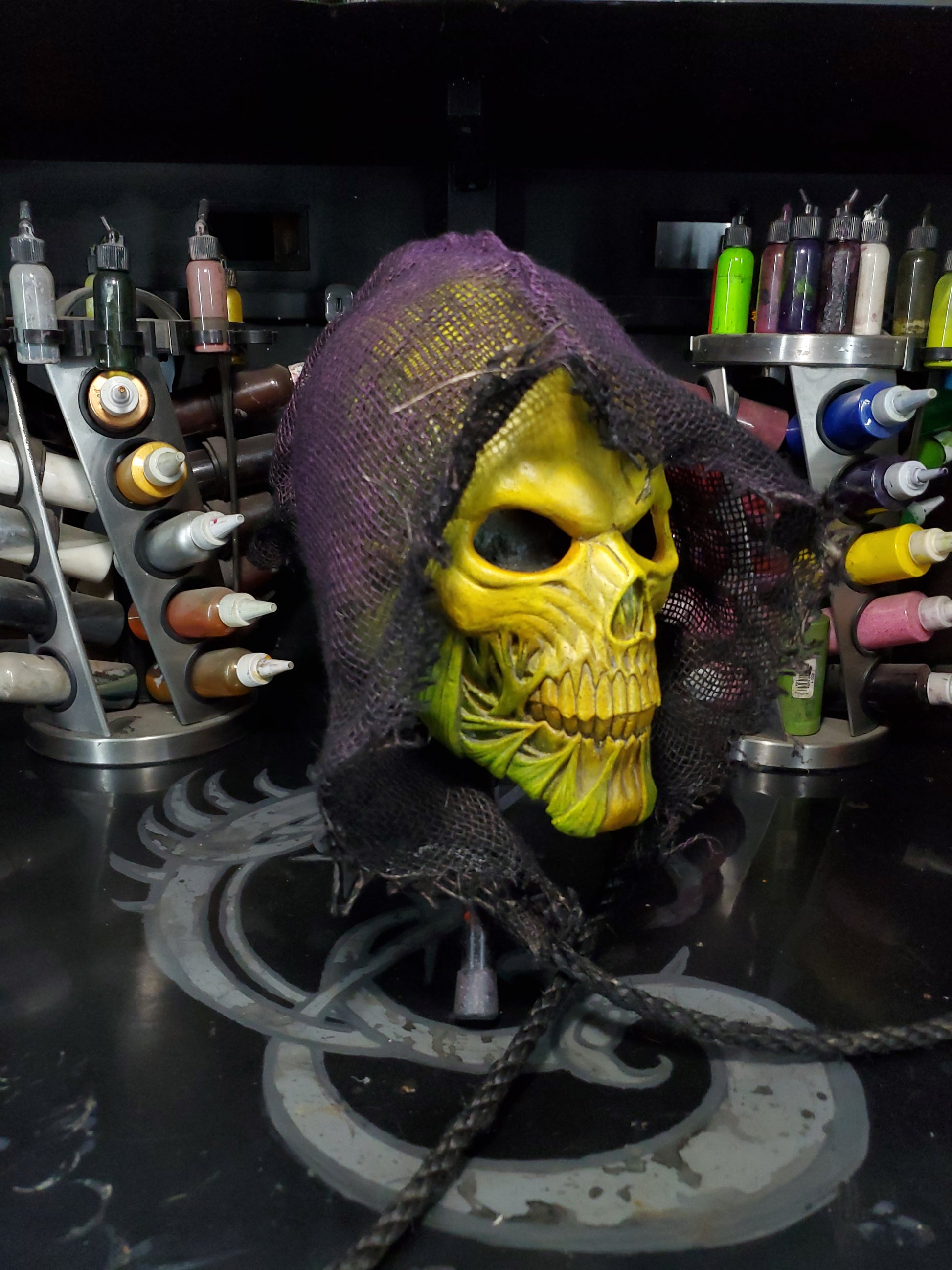 Welcome to REevilLution FX. The arsenal to your imagination. We bring you The Resurrected. An original design sculpted, molded and painted by yours truly. MR Grey. This Mask is a size XL. Or a 24 inch/ 62 cm circumference, or a 7 5/8 in hat size. These are made with the best latex in the industry. Monsters Maker liquid latex RD 407. Distributed by AFA supplies. Molded in hydrocal B11 from Aardvark Clay and Supplies. Sculpted in plastelina costumed in house.